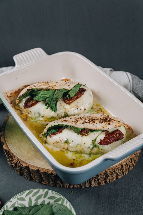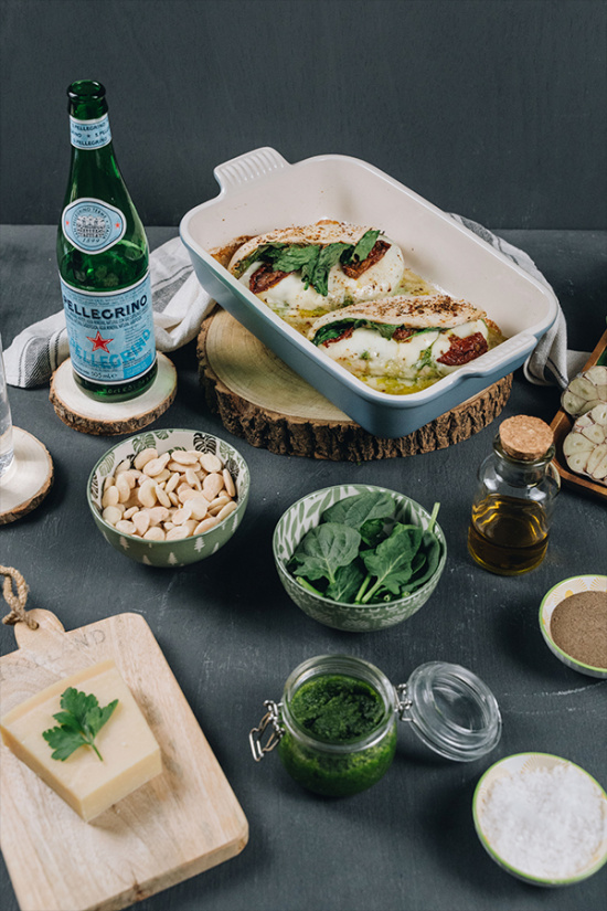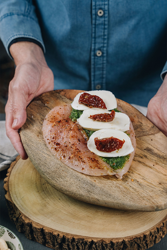 • Distribuir el pesto sobre las pechugas de pollo y terminar con la mozzarella fresca cortada en rodajas y el tomate seco en pequeñas tiras.