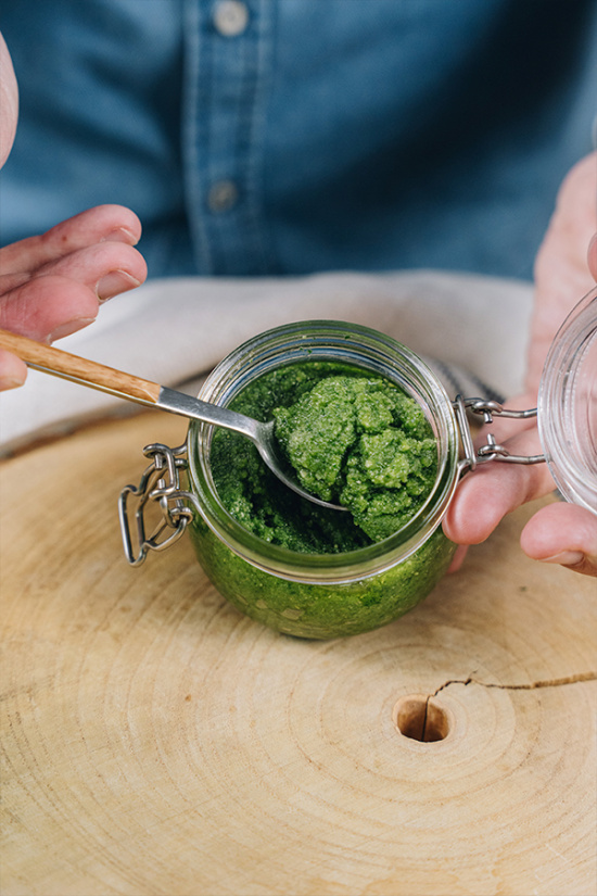 • Para el pesto, añadir todos los ingredientes en un robot de cocina y triturar hasta conseguir una pasta verde y densa.