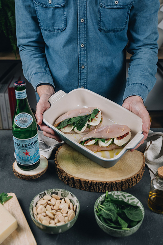 En esta propuesta culinaria, tradición y modernidad se encuentran: el pollo se viste de pesto y se eleva con un maridaje perfecto, acompañado de las burbujas de S.Pellegrino y el carácter único de los vinos de la Sierra de Gredos (Madrid).
