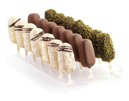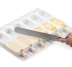 Este práctico molde permite recrear diferentes sabores y elaboraciones en forma de palito helado. Lo habitual es un sorbete o un helado bañado en chocolate pero también, puede preparar un cremoso foie gras recubierto con un glaseado para poder comerlo de un bocado.