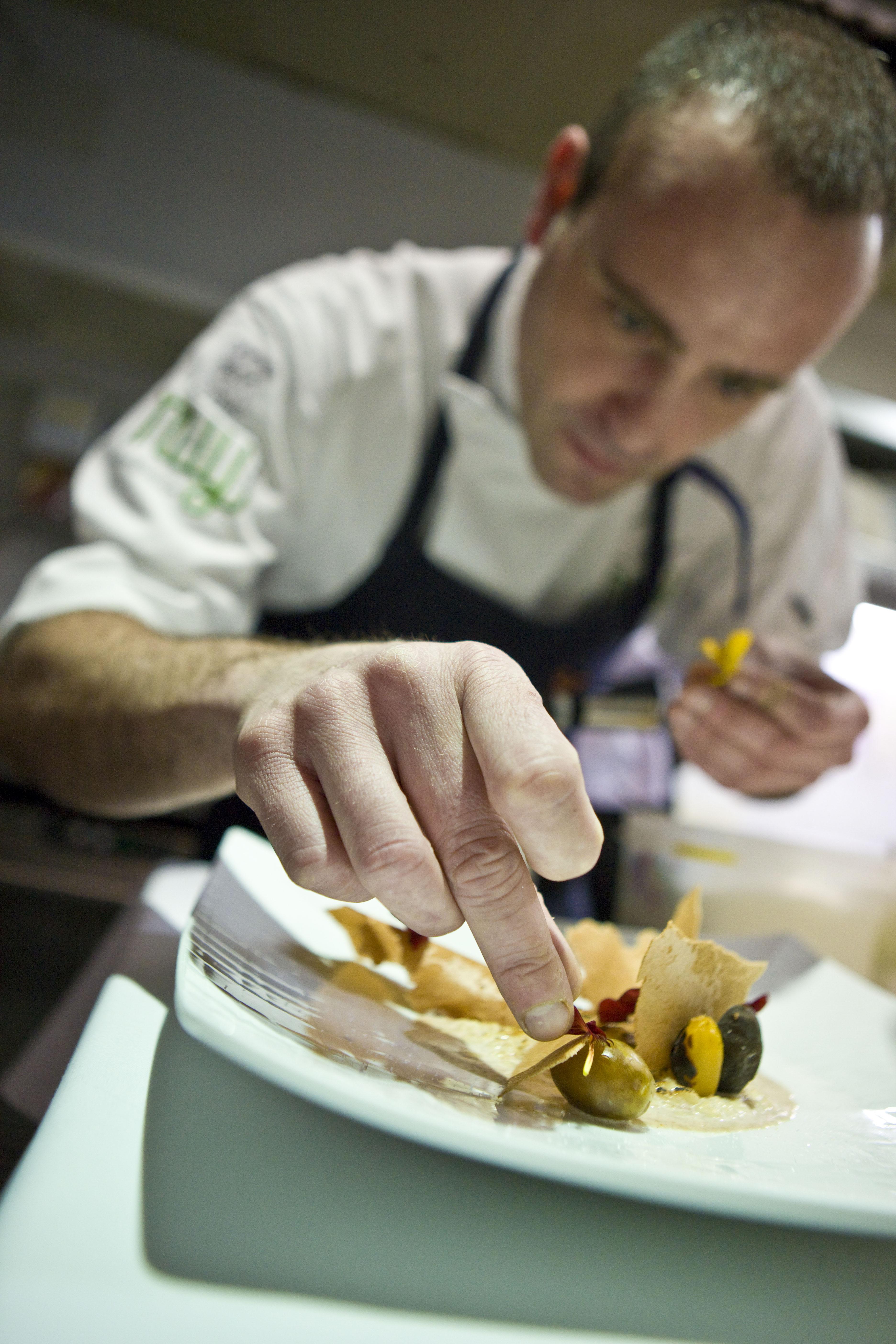 Rodrigo de la Calle enplatando un postre a base de fresas