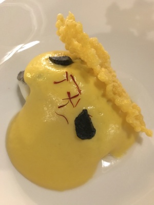 Como tradicional es el bacalao en amarillo, aunque aquí se le da una vuelta y es cubierto con una espuma de este guiso de patatas y azafrán. Hay que decir que Castillo se maneja muy bien en las emulsiones y salsas.