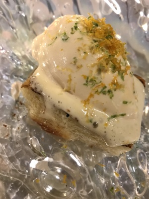 A modo de aperitivo, nos deleito con un sublime nigiri de espeto de sardina. Sin palabras para este bocado. Algo menos me gusto, por su falta de sabor, la piruleta de lagarto ibérico y langostinos. Esta iba acompañada de una salsa agridulce picante. En la copa, Acontia 2016, un vino de la denominación de origen Toro 100% variedad verdejo.