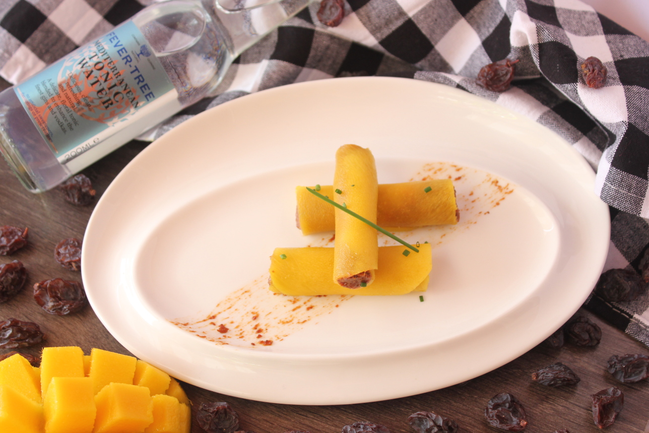 Con la ayuda de un buen cuchillo, pelamos el mango maduro y hacemos unas rodajas bien finas. Rellenamos de la pasta anterior, como si de un canelón se tratase.