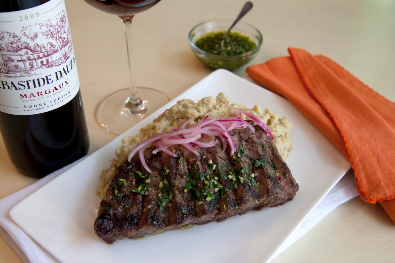«Bife de Chorizo» es el nombre típico del sabroso corte de carne que conocemos en inglés como New York Strip. Mangú es un majado de plátano, tradicional de República Dominicana y amado por todos los latinos, sobre todo cuando se sirve con una carne como el bife. A esto le quise añadir la gremolata, un «chimichurri» italiano, que se prepara con perejil y generalmente sin el aceite. La gremolata, aportará aún más sabor y aroma a esta plato. Es fácil de preparar y perfecto para una cena especial, o cualquier celebración acomapañado de la elegancia del este La Bastide Dauzac de Margaux.
