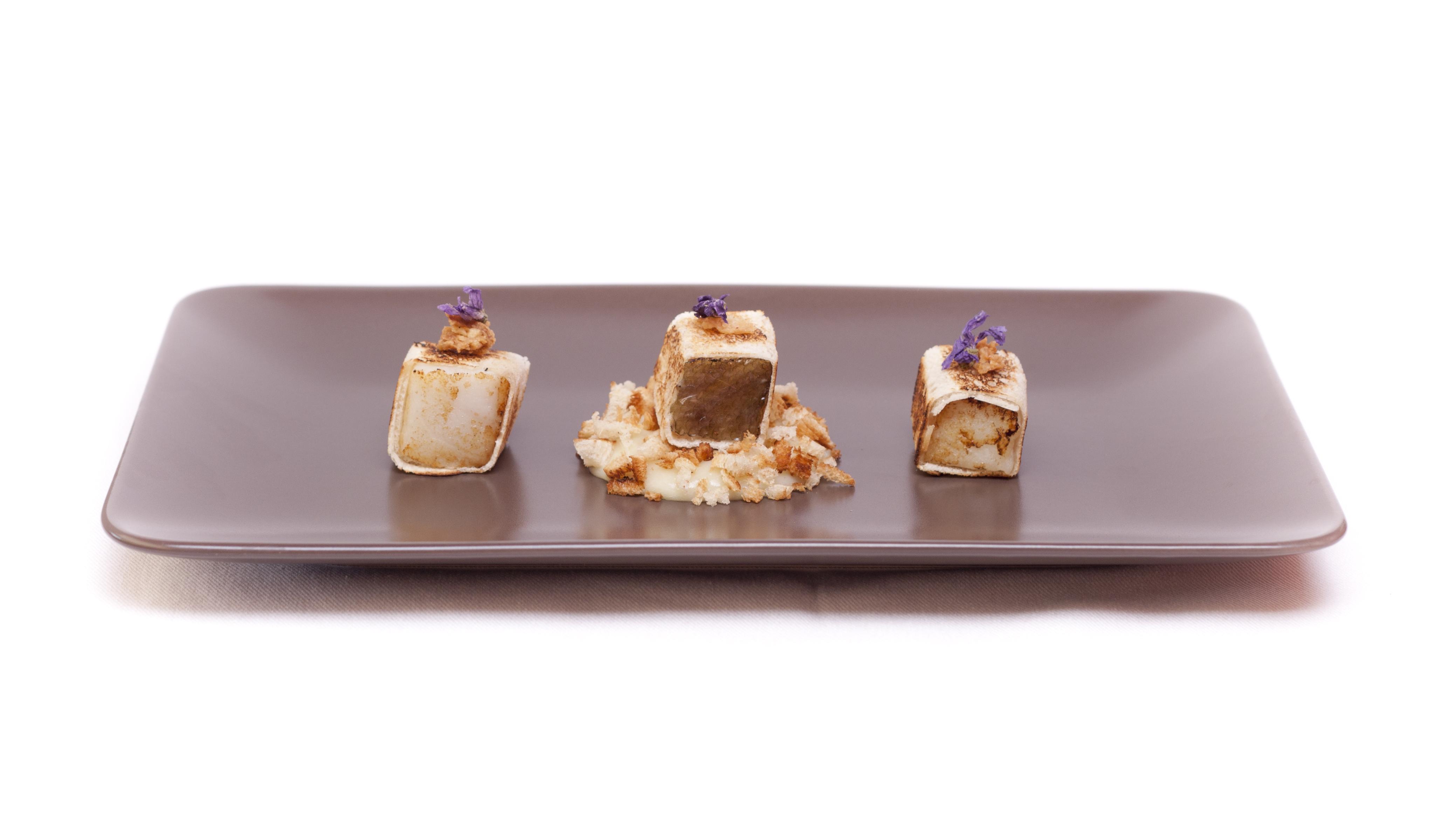 Colocaremos el culis de ajo en el centro del plato, tapándolo con el bizcocho de pimentón y los tres mini bocadillos de bacalao. Adornaremos con flores de violeta seca y unas láminas de ajo deshidratado. Toque de sal ahumada.