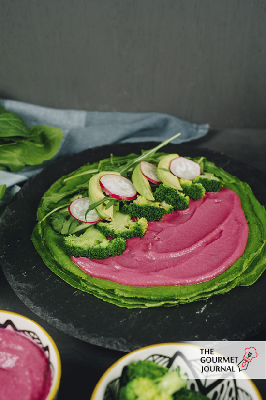 • Para el relleno, extender los crepes, untarlo con el hummus de remolacha y los diferentes vegetales.