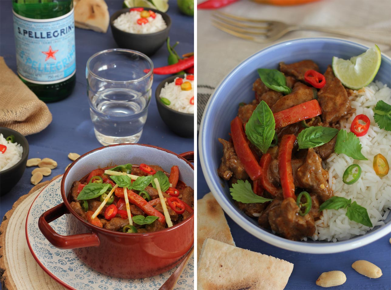 Combinamos un producto ibérico como el secreto con un toque de curry, coco y vegetales con una copa de vino tinto y un vaso de una refrescante agua con gas S.Pellegrino.