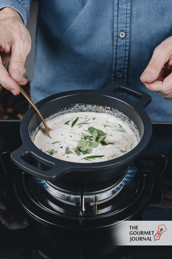 - En una olla pequeña, añadir la nata líquida, el diente de ajo laminado, el queso Gorgonzola, pimienta negra, nuez moscada y las hierbas frescas.
