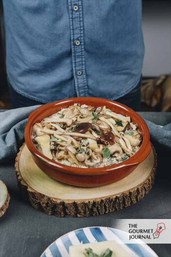 - En una fuente de barro, colocar una base de bechamel, luego una capa de patatas laminadas, el salteado de setas y, nuevamente, un cucharón de salsa.