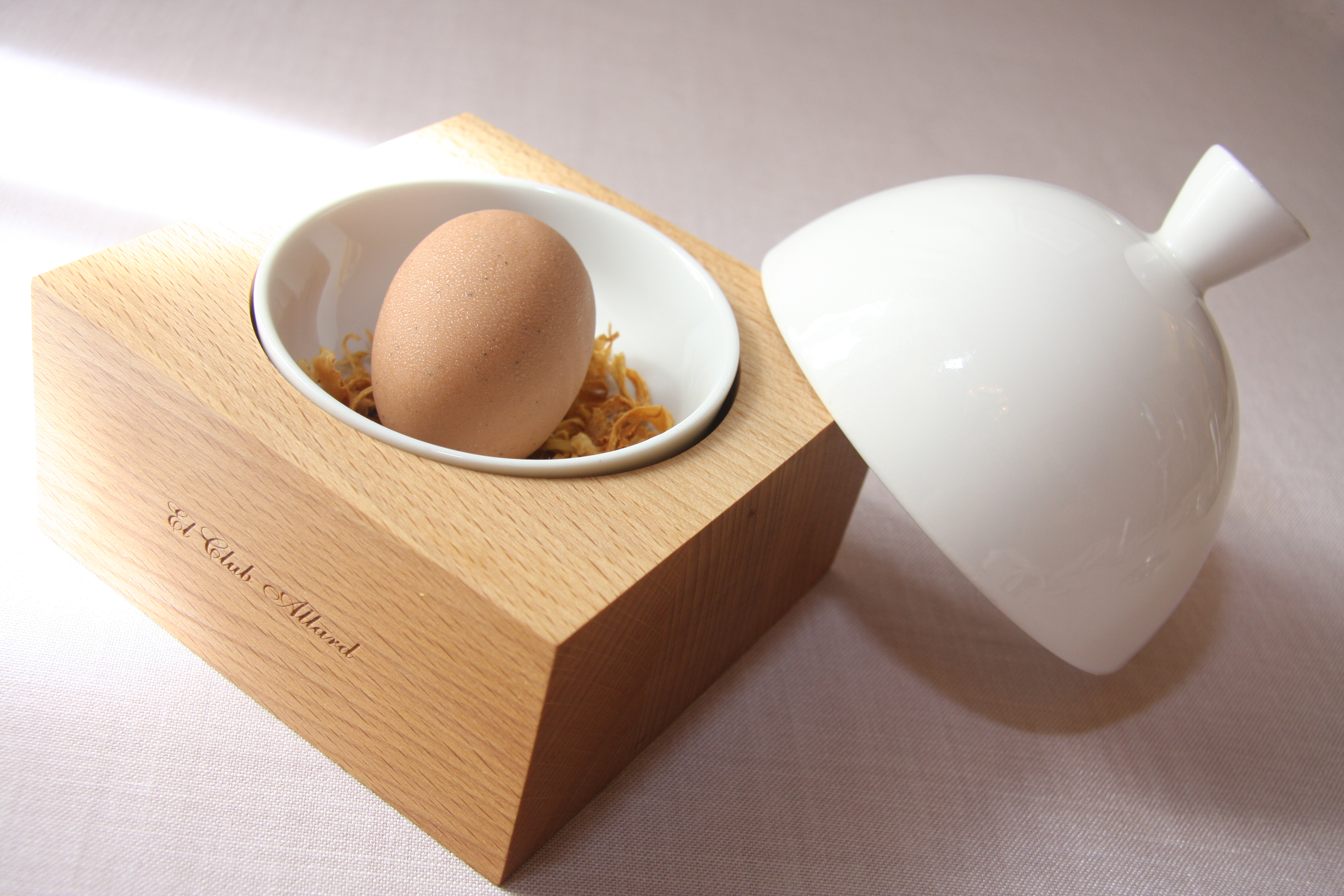 En la base de un bol, colocar un poco de paja de salsifí frita. Sobre ella colocar el huevo y tapar con la campana.