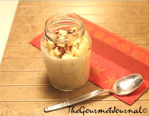 Colocar la crema en unos botecitos con el chocolate cortado a trocitos pequeños, terminar en el último momento colocándole la manzana verde en cuadraditos.