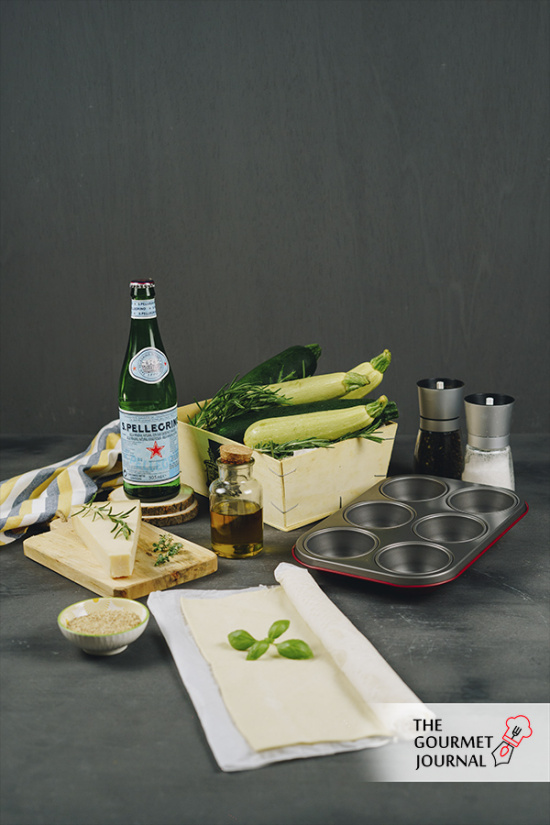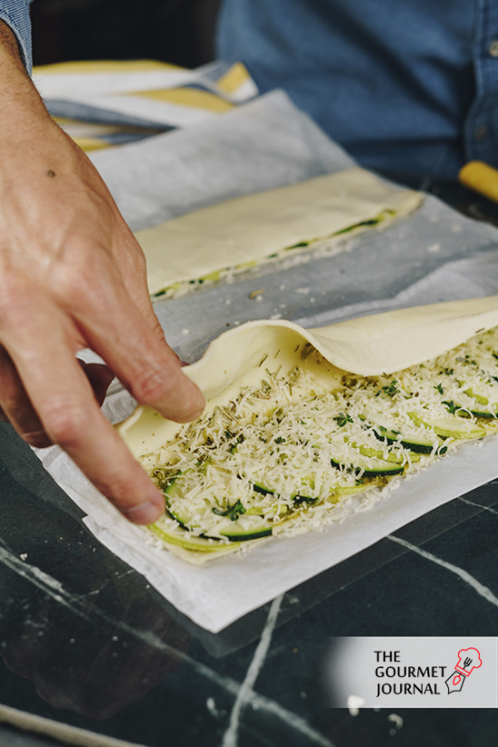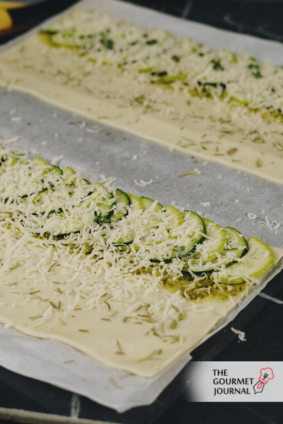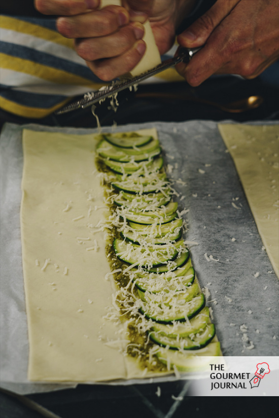 • Extender en la mitad de cada lámina de hojaldre una abundante capa de pesto verde y, por encima, los calabacines cortados finamente.