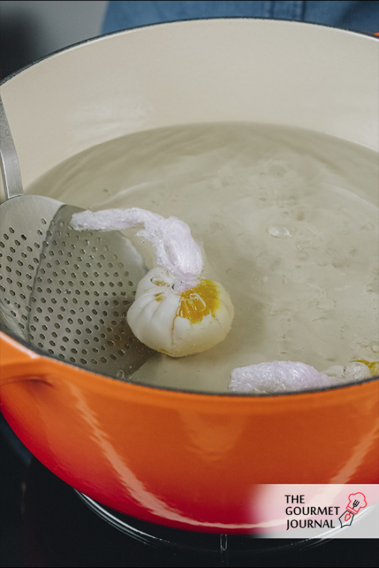 Retirar el film de los huevos cortando el nudo con una tijera y naparlos con la salsa holandesa de forma abundante.