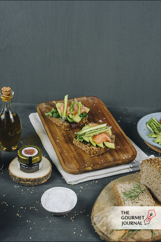 Para el emplatado, sobre una rodaja de pan de semillas de masa madre, disponer los brotes tiernos, el aguacate, el salmón ahumado y los espárragos.