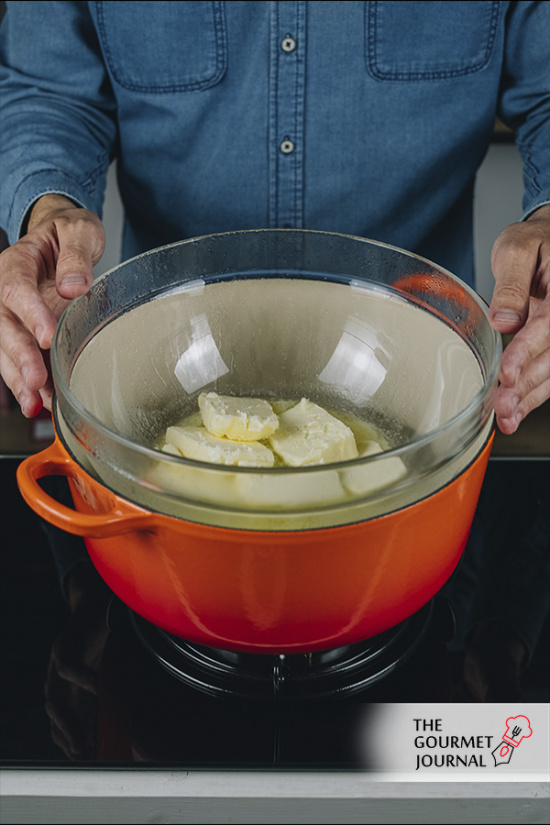 Para la salsa holandesa, en un bol al baño María, colocar la mantequilla hasta que se funda. Retirar las impurezas de la superficie. El resultado serán dos partes: grasa y suero.