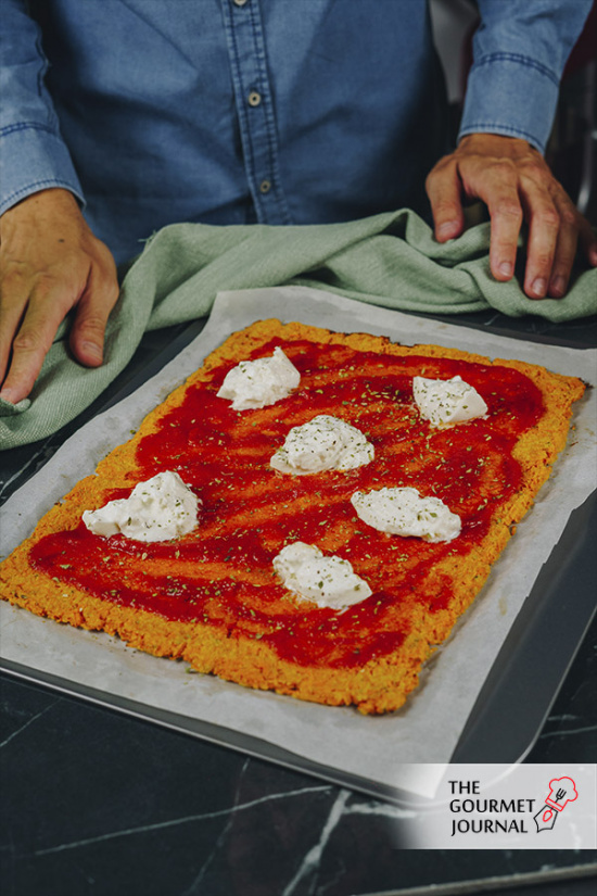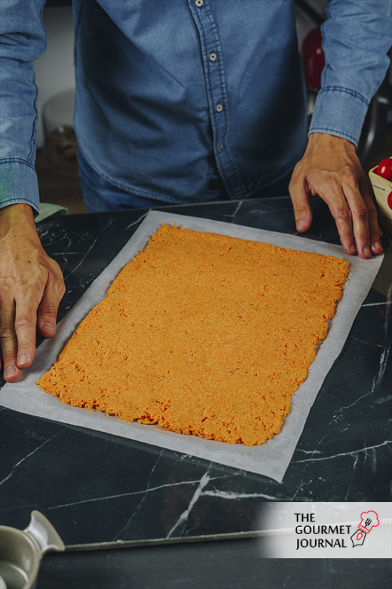 Disponer la masa de la pizza de zanahorias sobre toda la bandeja, presionando bien, y cubrir con un nuevo papel de horno.