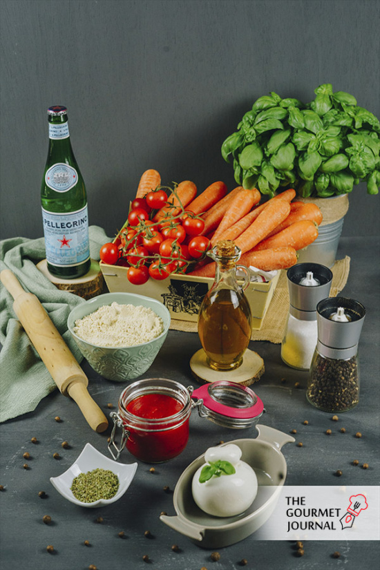 Sacar del horno, disponer la salsa de tomate sobre la base y la burrata.